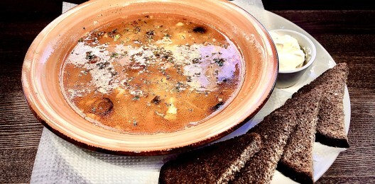 Куриный бульон, лапша, куриное филе, зелень, пшеничные гренки