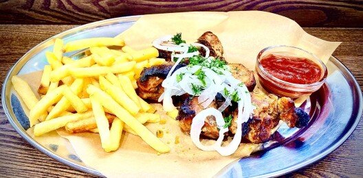 Нежнейшая свиная шейка ,фри,соус,лук, зелень