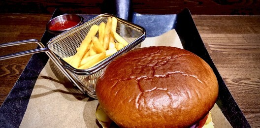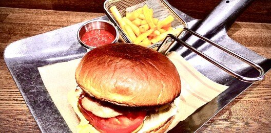 Черная булочка,2-е говяжьи котлеты,томаты,соус Бургер,салат Айсберг,соус Манго-Карри,Брусничный соус,огурчики маринованые,сыр Пармезан и Чеддер,картофель фри,томатный соус